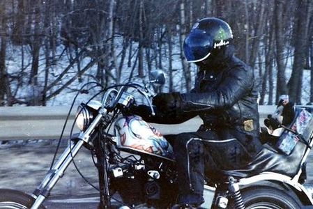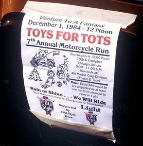 1978: Aminal, Puppy, Thor, Namu, Princess, and Mark-off planned the first TFT Parade. On December 13, 1978, Thor, Puppy and Aminal left from Fantasy Choppers on 2532 W. 63rd Street and headed for the Glenview Naval Air Station. There was only one motorcycle. Aminal originally was going to borrow a rigid-frame Triumph 250 but he couldn't get the bike started, so then he borrowed Puppy's Harley. On the way the bike's chain broke, but to make it a true motorcycle parade, Aminal had to get to the end. So he and Puppy held each other's arms, and he was towed to the Naval Air Station.