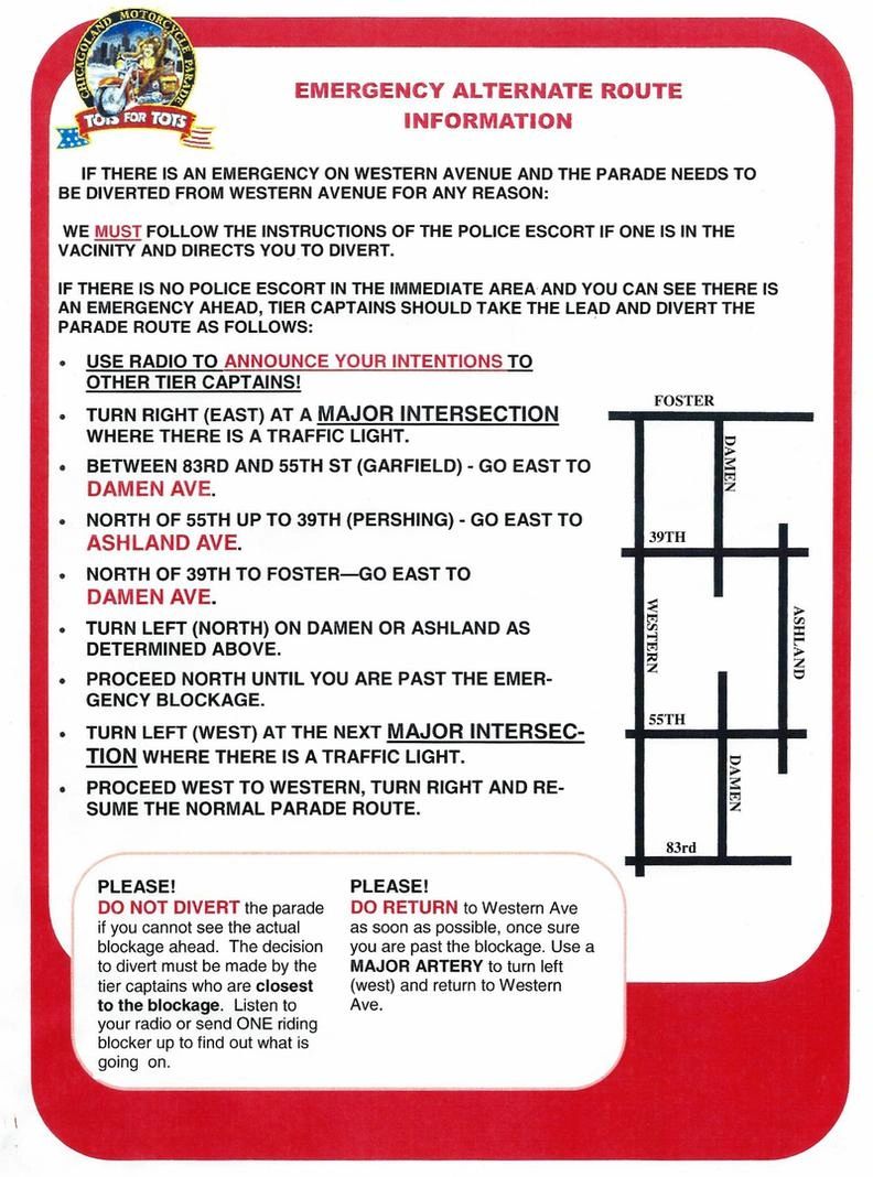 As the riders proceed north on Western Avenue, there will be many intersections, alleys and driveways along the route, where automobiles may occasionally try to enter The Parade. All these areas will be patrolled by volunteers and police officers, but all riders should still be aware of the actions of all cars near them along The Parade route. All riders are expected to ride in a careful, defensive manner. Careless and dangerous riding will not be tolerated. There will be hundreds of Chicago police officers and Parade volunteers, both moving and stationary, along the entire route, and they will immediately remove any riders that ride irresponsibly.